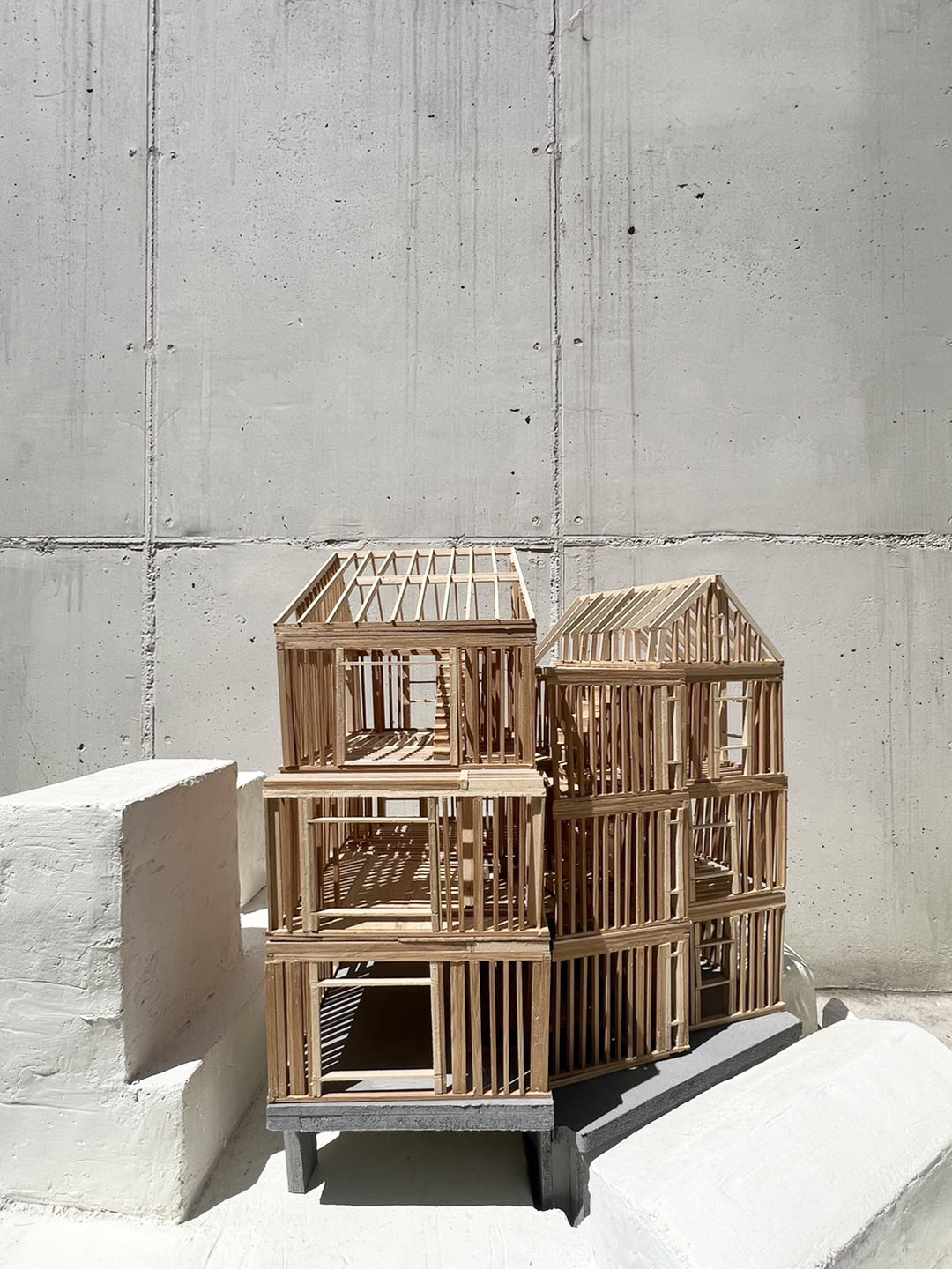 영등포구 신길동에 위치한 ‘Split House’는 7명을 위한 7개의 원룸주택으로구성되어 있다. 구옥이 있던 대상지 북쪽의 매우 좁은 골목에는 대지의 레벨차를 극복하는 옹벽이 자리하고 있었다. 기존의 옹벽을 파헤치고, ‘묵직한’ 콘크리트 기단 내에 지상층을 계획하여 대지와 건물의 기준선을 확보하고 ’옹벽’을 점유하였다. 옹벽 위에는 ‘가벼운’ 경량 목구조 방식으로 각기 다른 창들을 계획하여 ‘집합’주택 내 ‘개인’적인 집들을 쌓아 올렸다. 수많은 소규모 다가구 주택이 밀집되어 있는 동네에 어울리는 분절된 매스감을 구성을 목표하였고, 3개의 원룸을 쌓아 올린 두개의 볼륨을 엇갈리게 Split배치하고 사이에 코어를 계획함으로써 현관 출입 시 프라이버시를 느낄 수 있게 하였다.